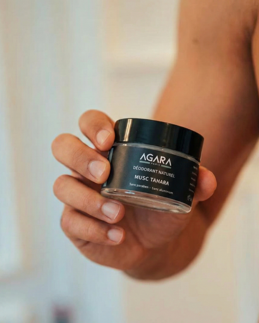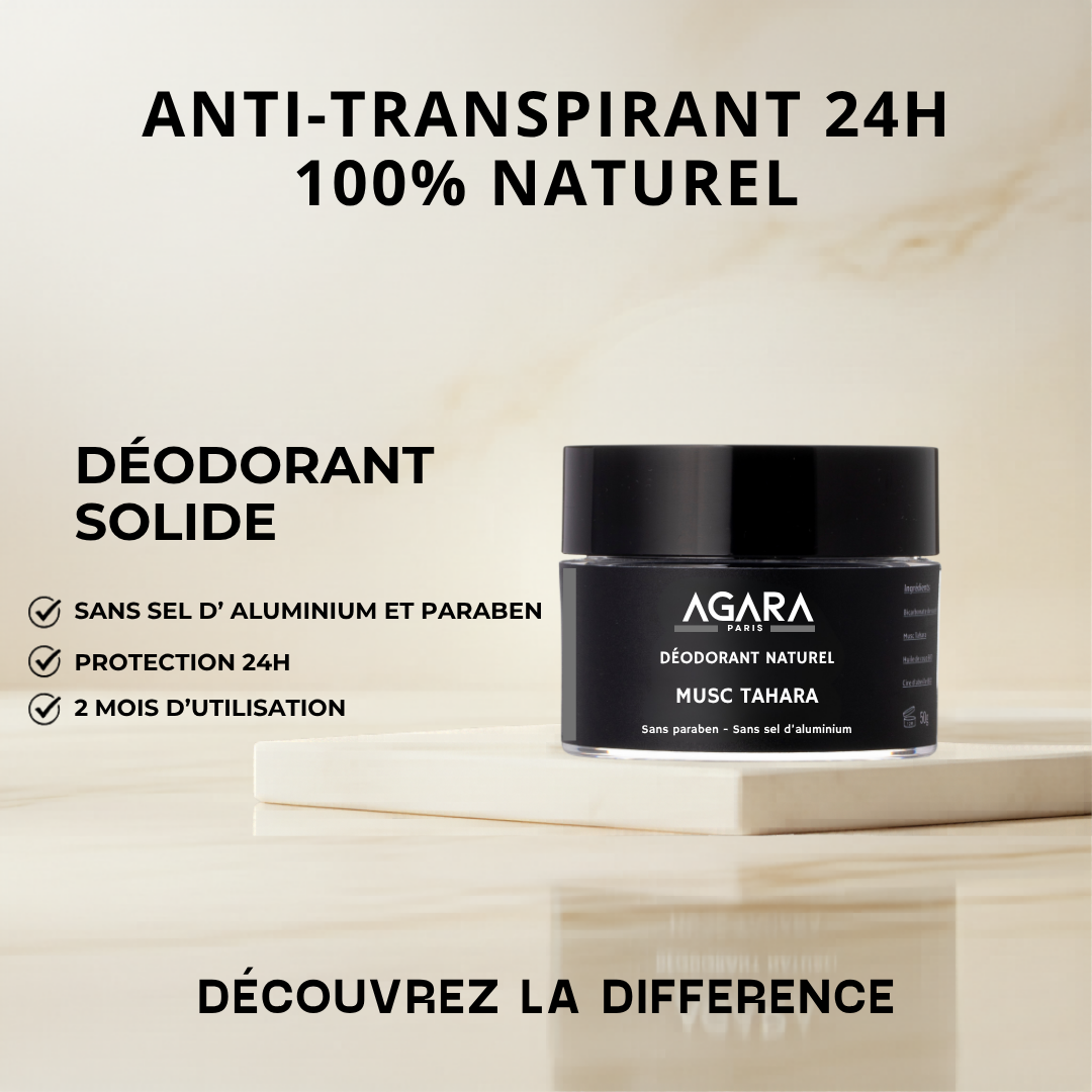 AGARA bouscule les codes avec son déodorant solide 100% naturel qui ne fait aucun compromis sur l'efficacité. Sans paraben ni sels d'aluminium, il reste redoutable contre la transpiration et les mauvaises odeurs. Formulé avec de la cire d'abeille bio, de l'huile de coco bio, du musc Tahara et du bicarbonate, il protège votre peau tout en respectant votre santé.